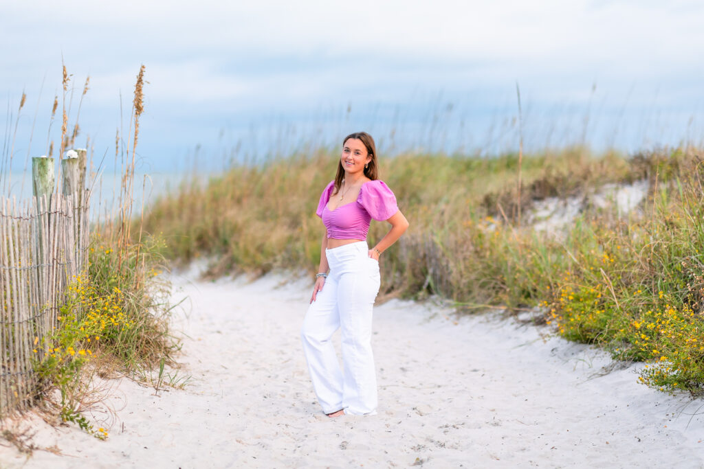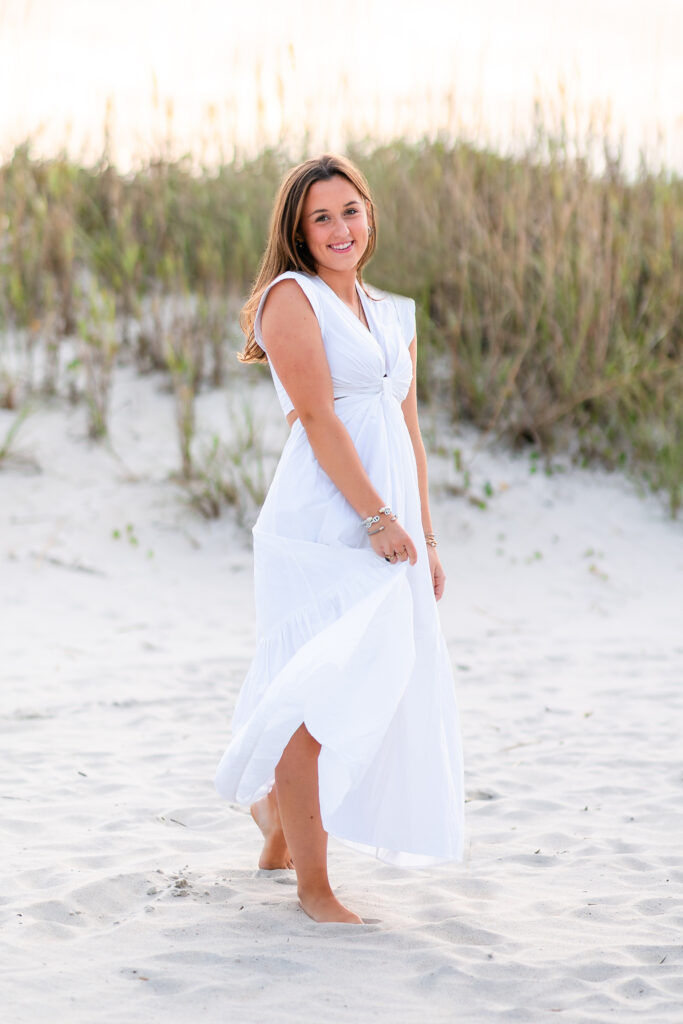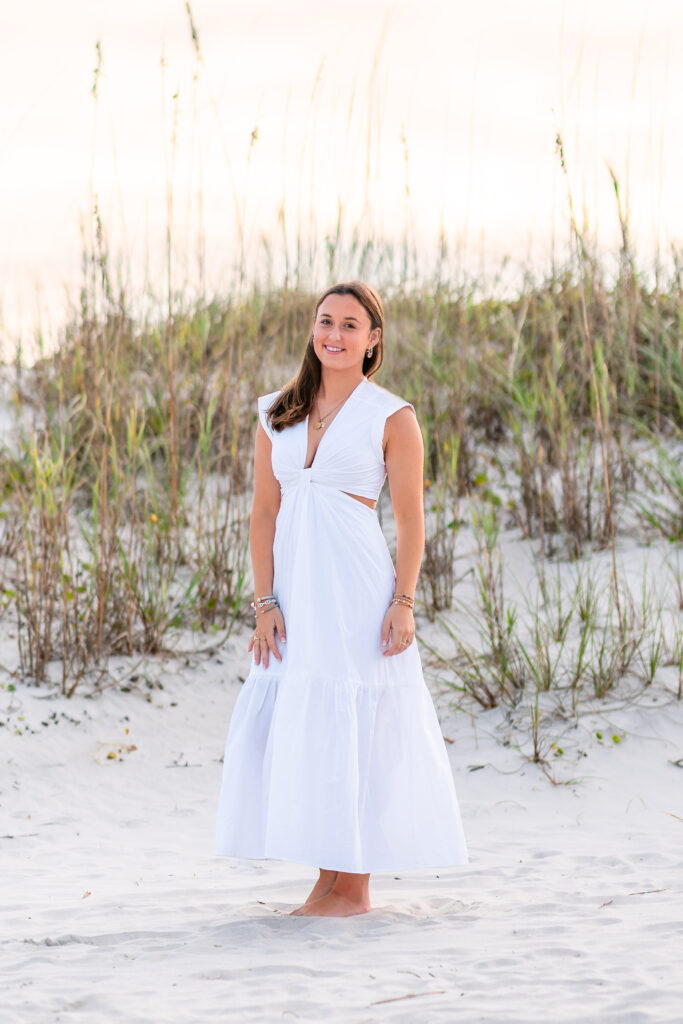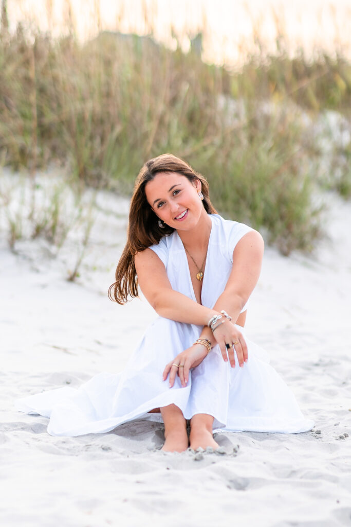 After soaking up all the beauty of Airlie, we headed to one of my favorite places—Wrightsville Beach. Milly was stunning against the dunes, surrounded by soft light, sea grass, and that peaceful coastal glow.