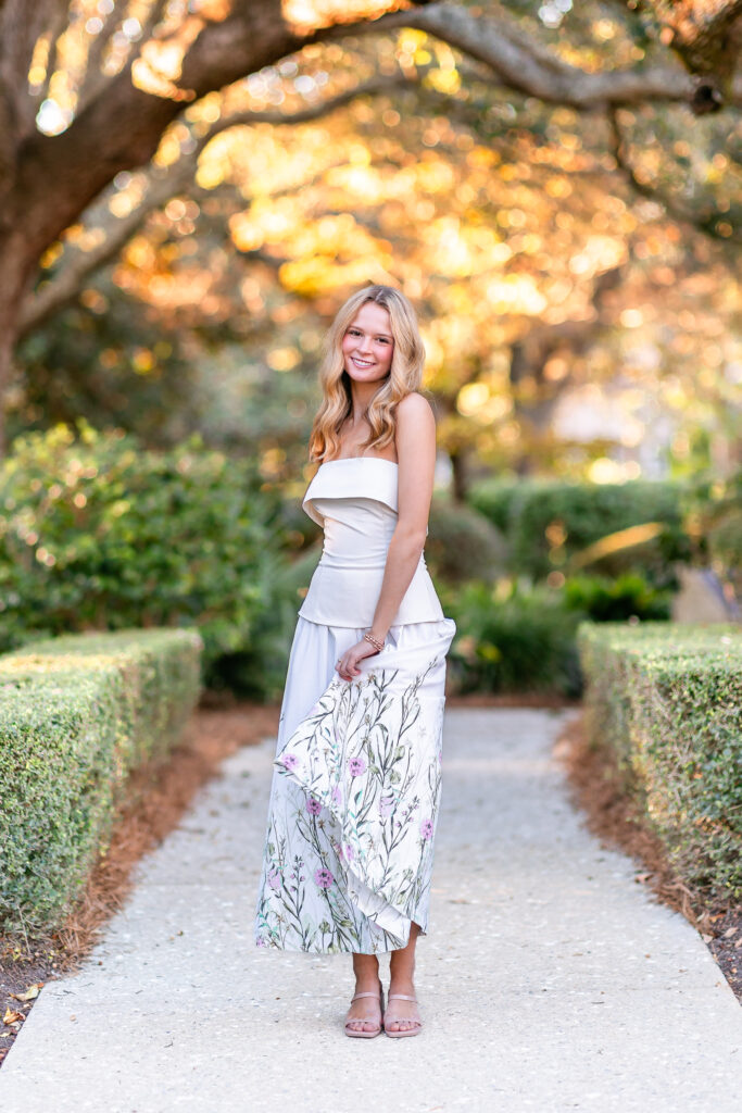 We began Charlotte’s session in the garden, where the golden light peeked through the trees and the lush greenery wrapped around her like a storybook backdrop. It was one of those afternoons where everything was perfect! Charlotte was a dream from the first click of the shutter. She’s naturally graceful, beautiful, and quick to laugh. Watching her shine in that soft, glowing light felt like magic.